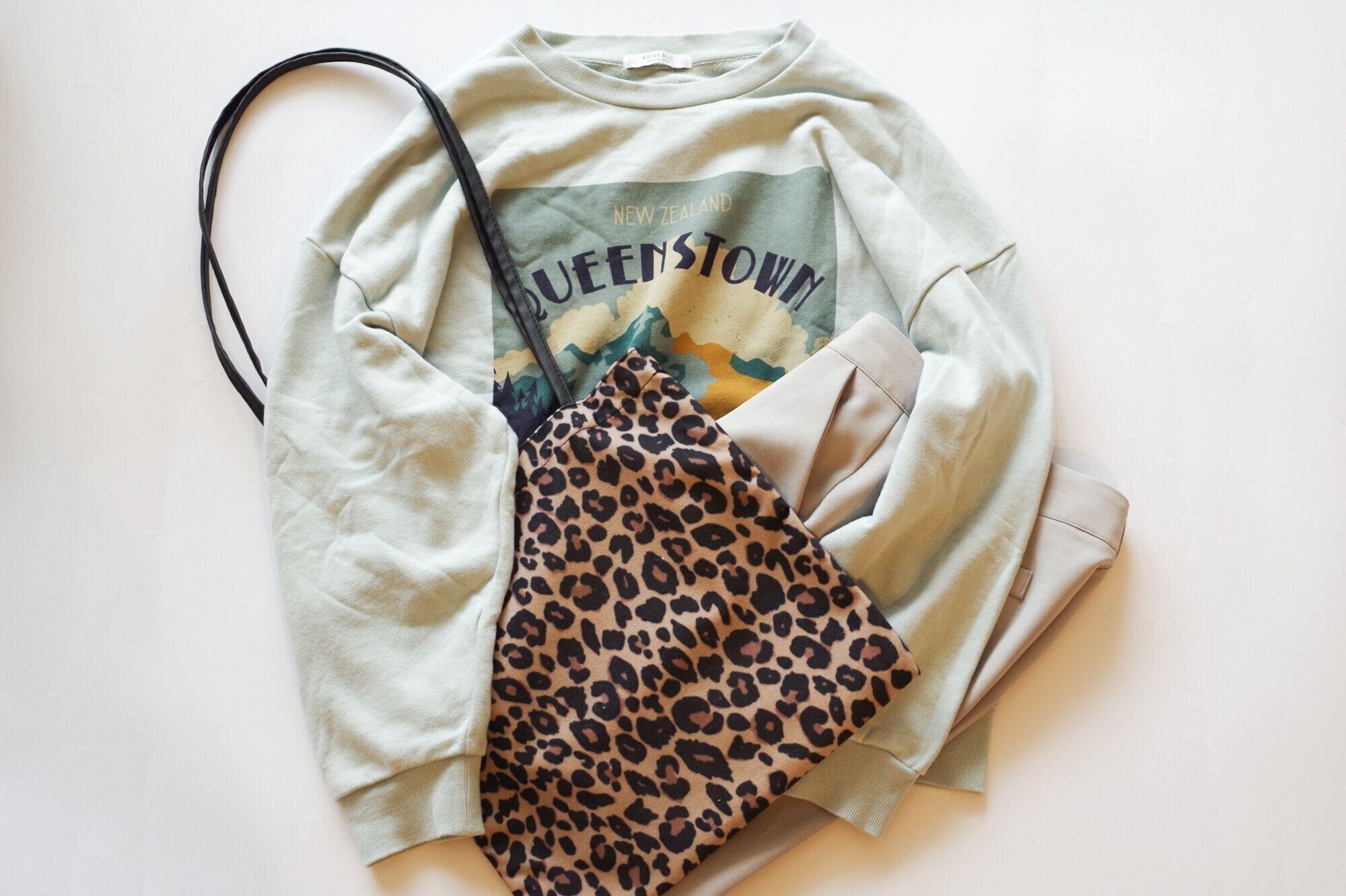 淡い春色トーンの着こなしもレオパード柄を取り入れることで秋らしく昇華。ミント色は、季節感のある小物を添えることでシーズンレスで着回せるように。あえて秋に着る春色トーンの着こなしは、変化が出せて新鮮です。