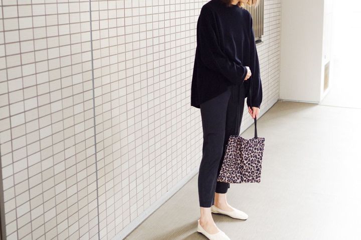 まずは、オールブラックのスタイルにレオパード柄を差し色にしたコーデ。私の中ではレオパード柄バッグを手にしたら、してみたかったコーディネートです。レオパード柄を取り入れることで、ダークトーンの着こなしも華やぎが加わります。