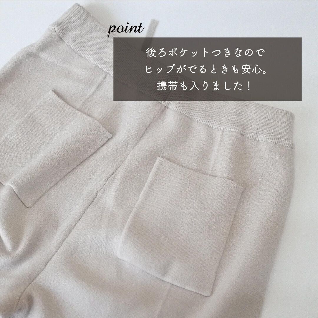後ろにパッチポケットつき。ポケットがあるとヒップが出る丈のトップスを着ても安心。ニットパンツにありがちな部屋着感も薄れますよね。