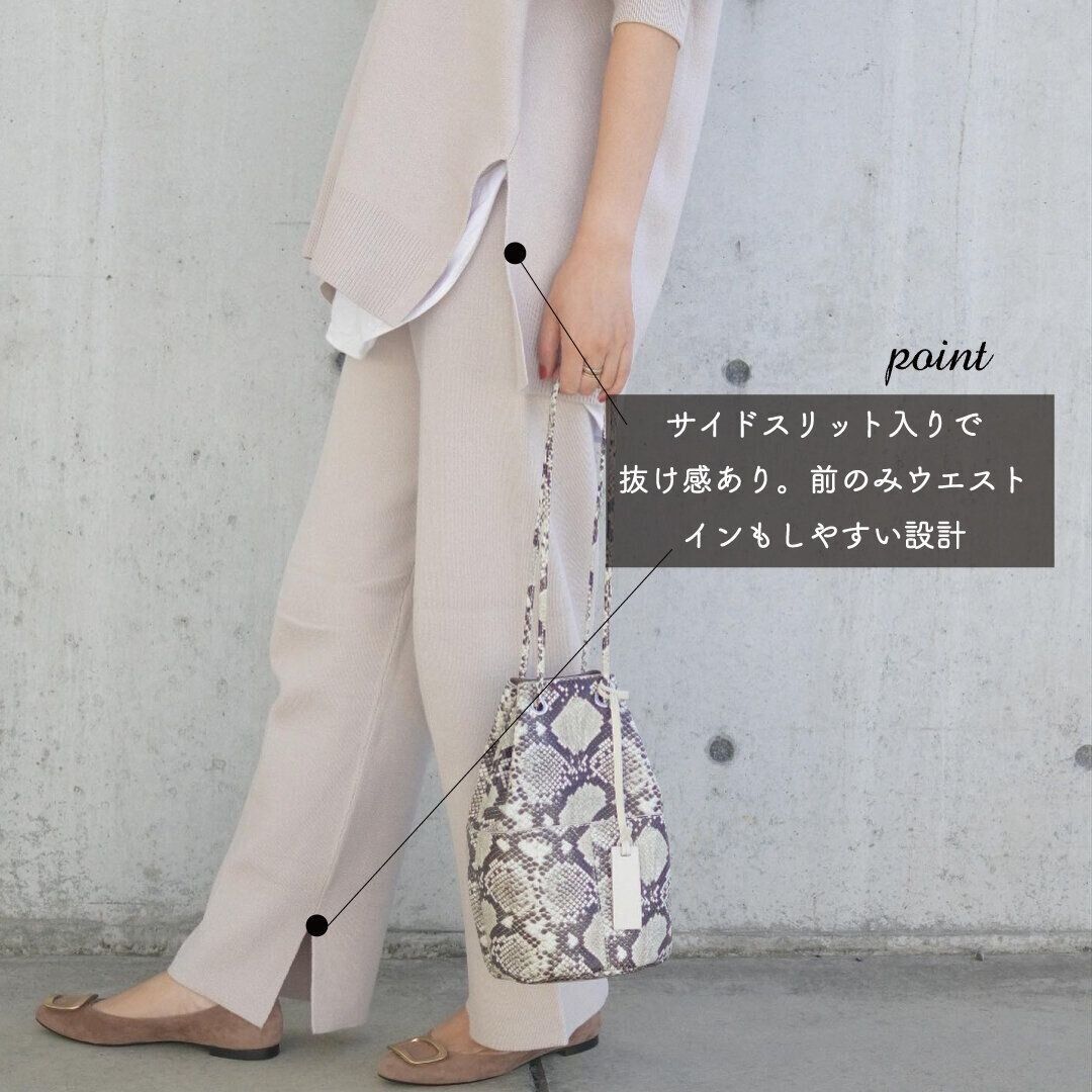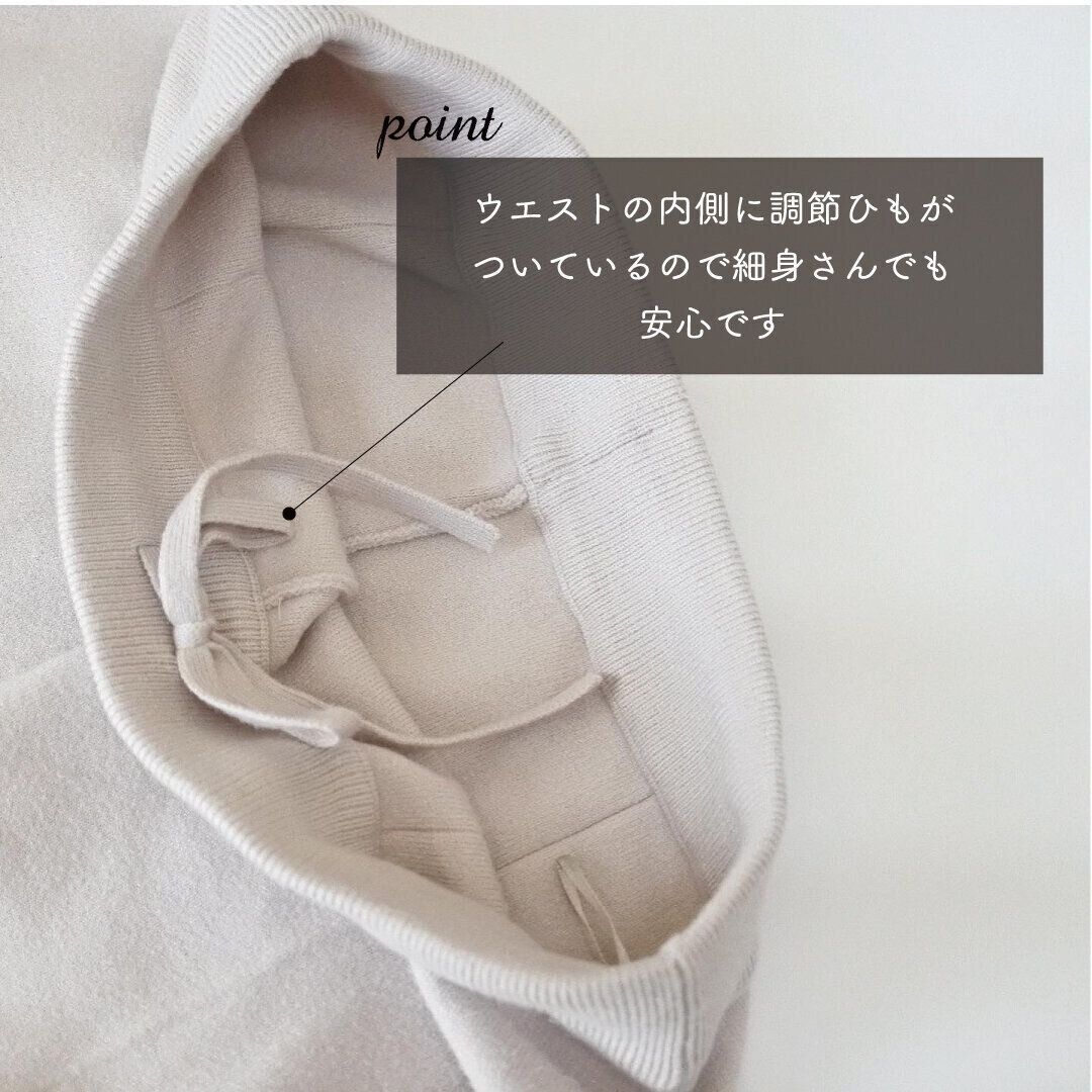 同素材のニットパンツ。センタープレスがはいっているので脚長効果もあり!ウエストは内側に調整リボン付き。