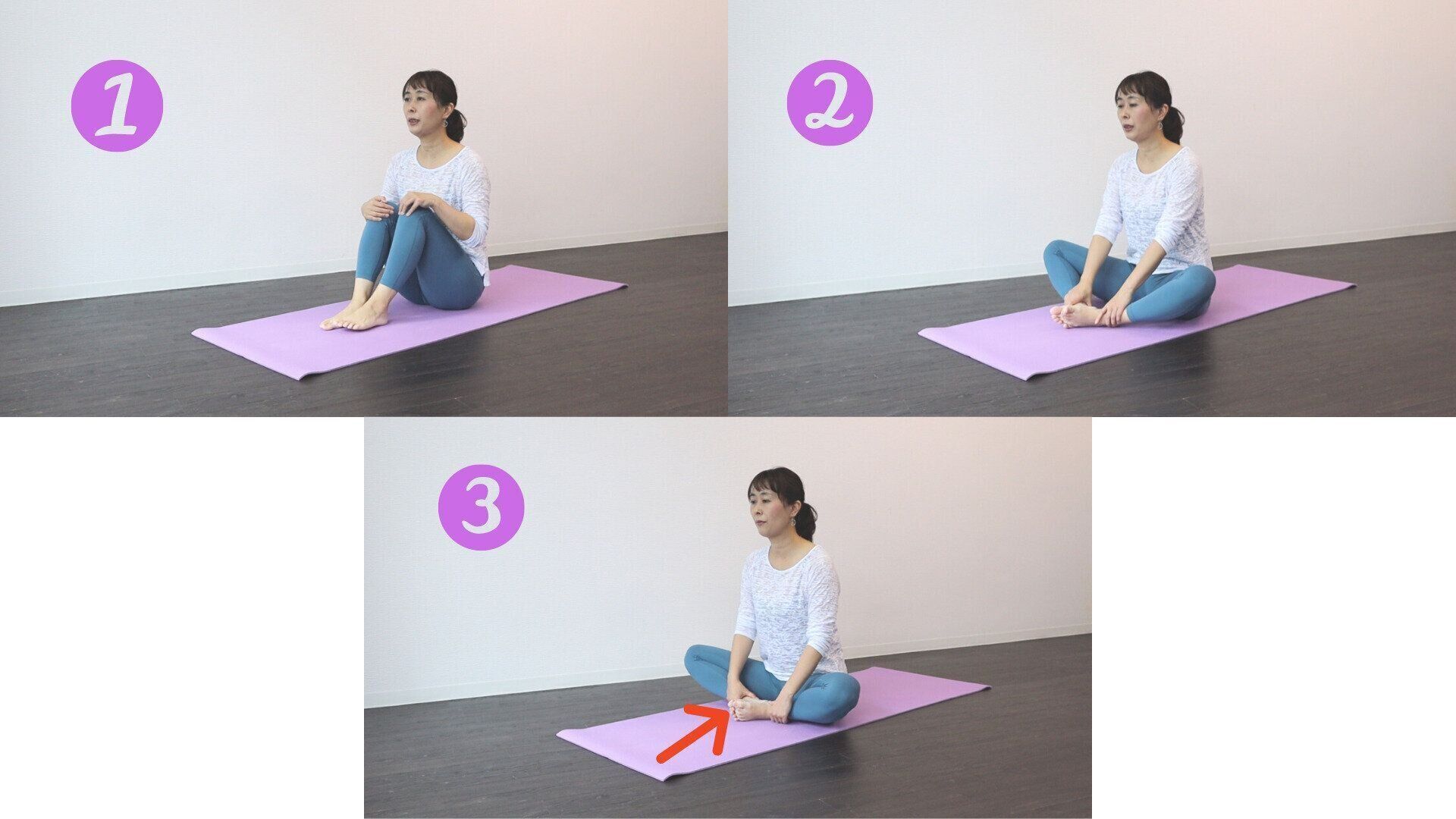 (3)合わせた足をカラダの方に引き寄せて近づけます。