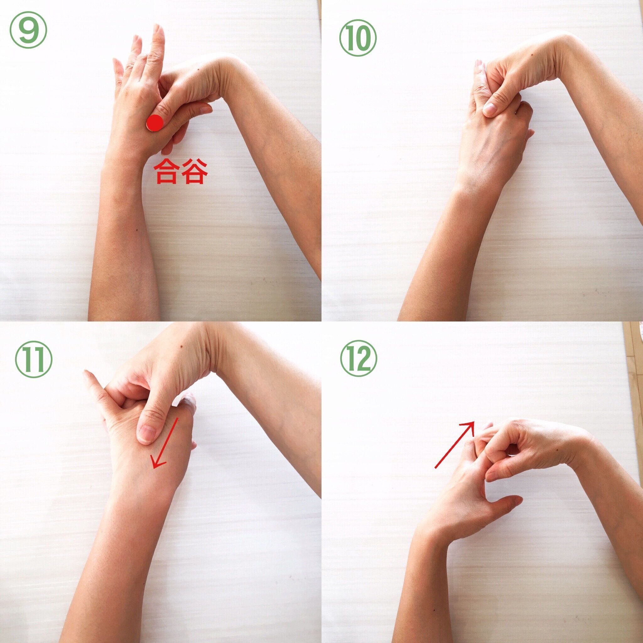 (9)手の甲側の人差し指側の骨のキワ、親指と人差し指の骨が接する部分に【合谷】というツボがある。反対の手の親指をツボに当て、人差し指のキワに引っかけるように押し上げる。