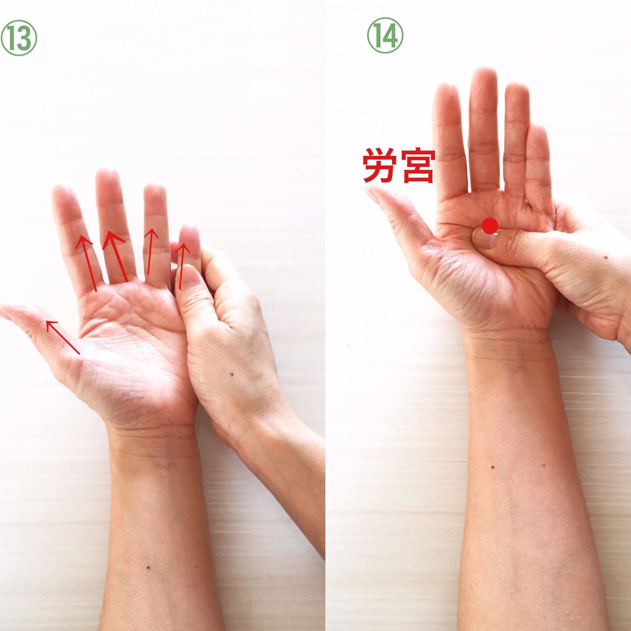 (14)中指の骨を下にたどっていくと、くぼみに当たる。その少し薬指側が【労宮】というツボ。