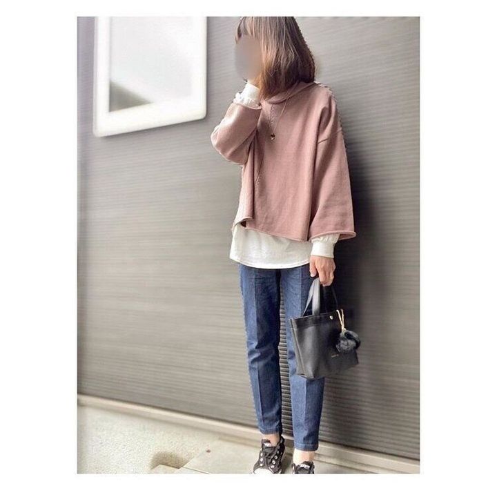 「美シルエットパンツ(1,790円)」を使ったカジュアルコーデ。レイヤードトップスにスッキリした細身のデニムをチョイスして洗練されたカジュアルスタイルに。