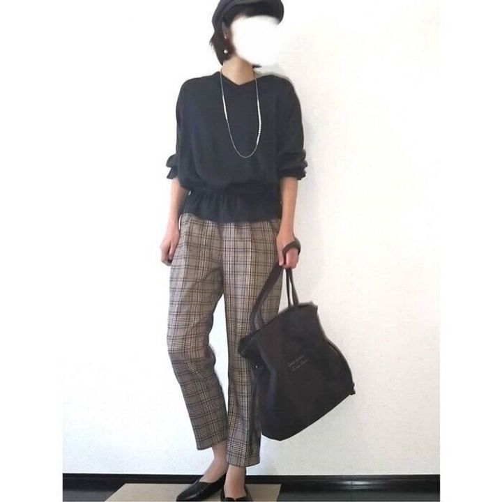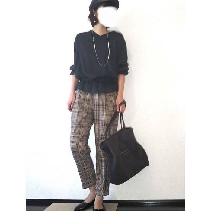 今期流行のグレンチェックは「ドロストテーパードパンツ(1,790円)」のきれい目シルエットを取り入れれば、若づくりしすぎない大人っぽい印象に。トップスや小物に黒を使うことで、流行を押さえつつも洗練された高見えコーデが完成します。