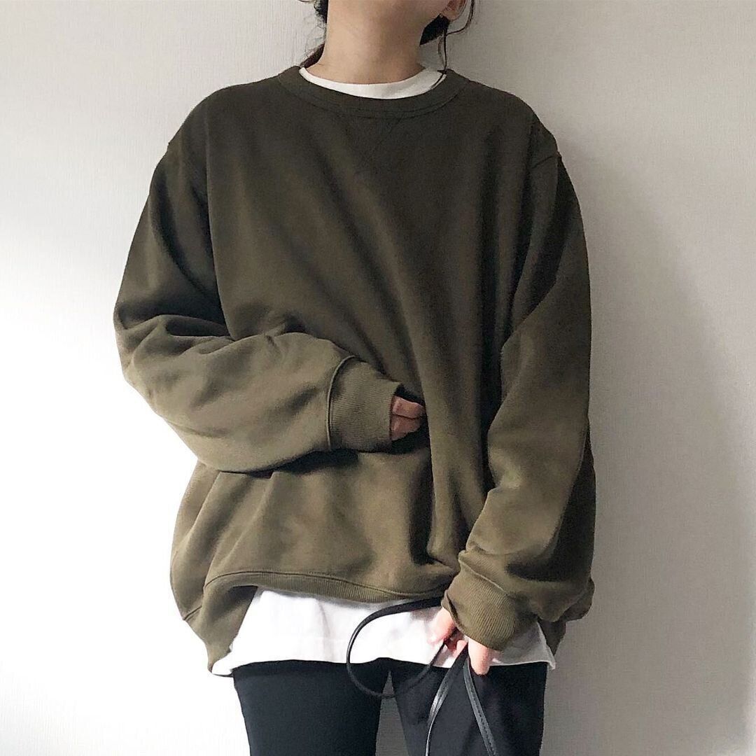同じくメンズアイテム「スウェットシャツ」を使ったレイヤードコーデです。インナーに着用されているカットソーは、GU「ロングスリーブT」。同じブランド同士で組み合わせると、購入時にサイズ感のバランスが確認できるのでおすすめです。