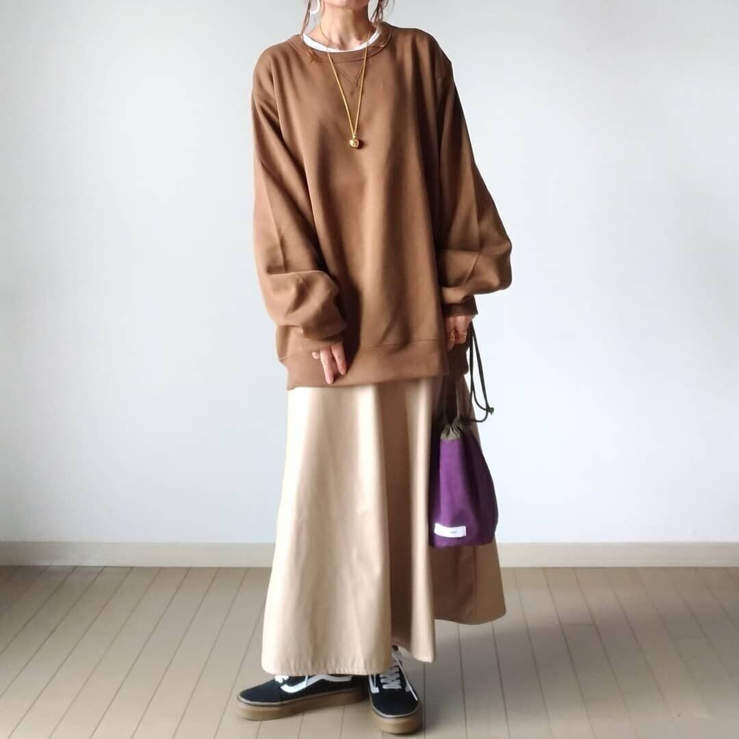 同じスウェットシャツを、今度はフェイクレザースカートでお出かけ仕様に。カジュアルなスウェットと辛口なレザーの質感をミックスさせることで、今っぽい大人カジュアルを叶えてくれます。スウェットシャツのサイズは、XL。あえて思いきりサイズアップすることで抜け感が加わります。