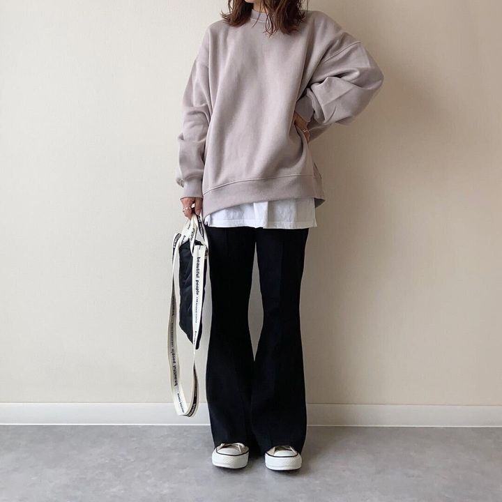 ゆるっとしたサイズ感ですが、広がりすぎないシルエットなので、フレアパンツと合わせてもバランスを取りやすいです。インナーにカットソーをレイヤードするとメリハリ感も生まれます。