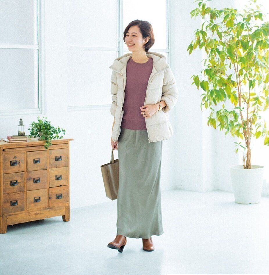 寒い日はダウンジャケットを着たいけど、「私には似合わない」と敬遠する人も。大人に似合うダウン選びは?「大事なのが色。定番の黒は、スポーツ感が強すぎて、実は着る人を選びます。おしゃれに見えるのはトレンドカラーのブラウン系。ソフトな雰囲気で、どんな服にも合わせやすいですよ。フェミニンなコーデが好きならオフホワイトなどの明るいキレイ色が◎」。