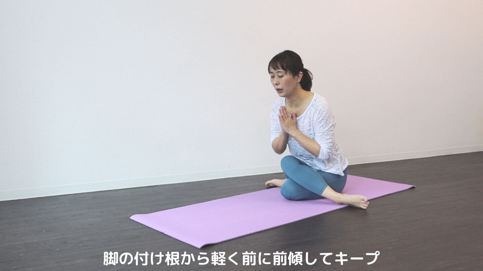 胸の前で合掌して、脚のつけ根からゆっくり上半身を前に倒します。