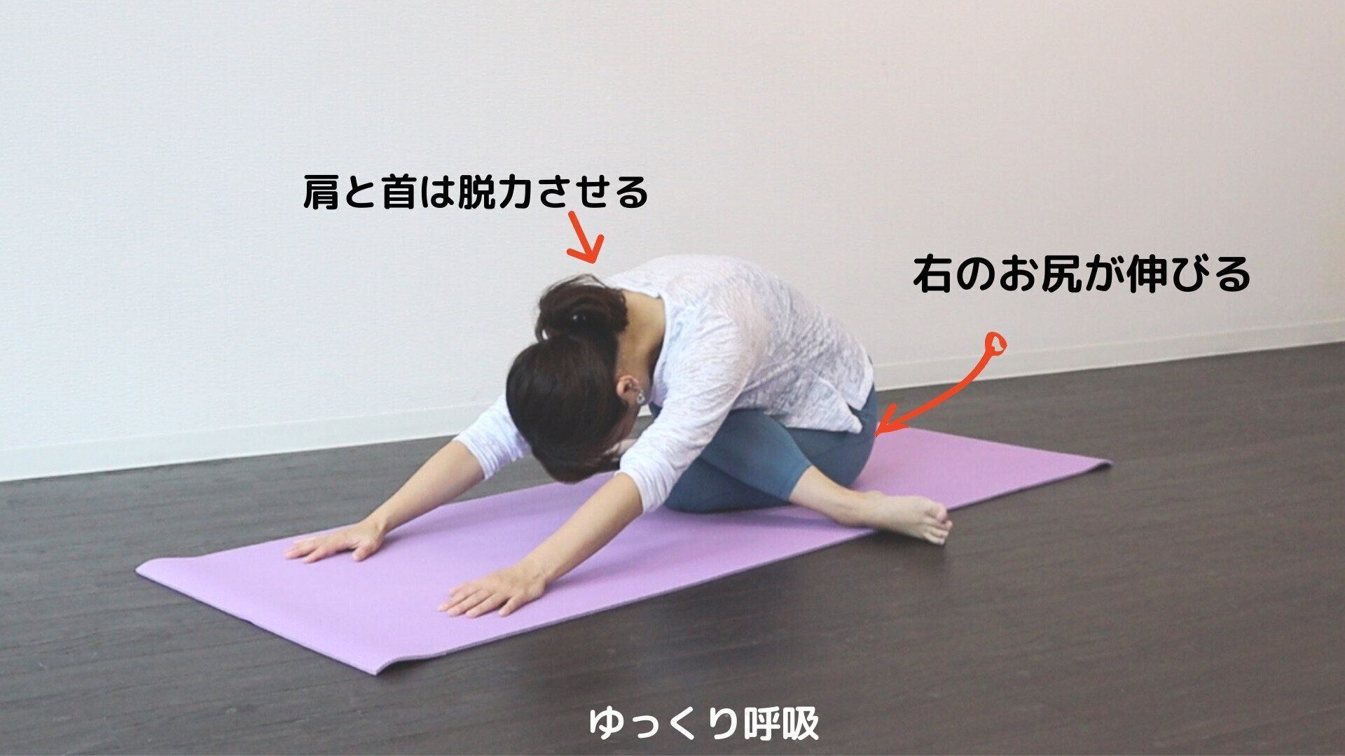 今度は、左お尻の筋肉がイタ気持ち程度に伸びているところで呼吸を5回行います。