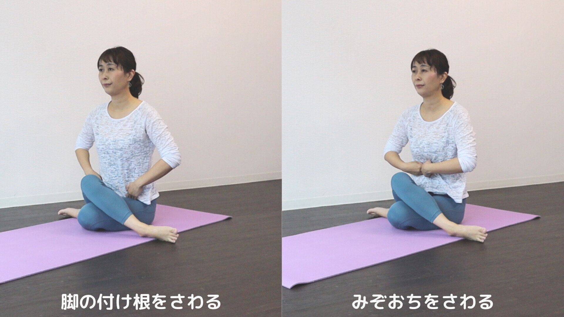 脚のつけ根とみぞおちをさわっておくと、ムダな力が抜けてポーズがやりやすくなります。