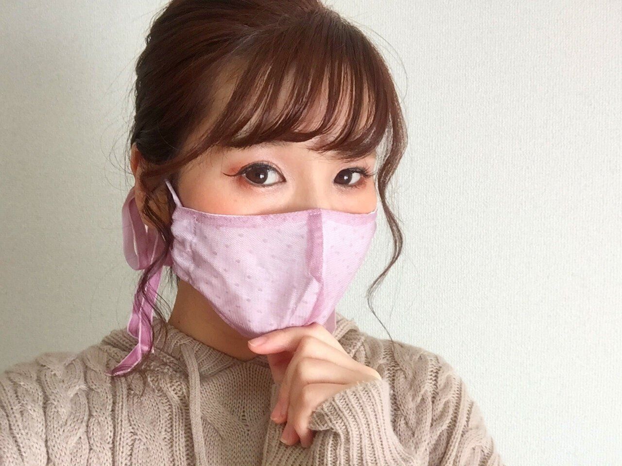 このマスクのかわいいポイントは、耳ひものリボンが長めなので、調節して結んだ部分がアクセサリーのようにかわいいところ!