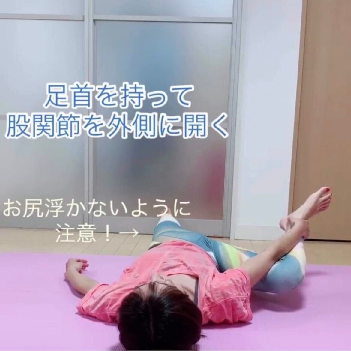2 可能な範囲で外側に開いて、内ももを伸ばします。30秒キープ。