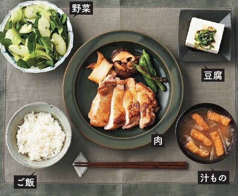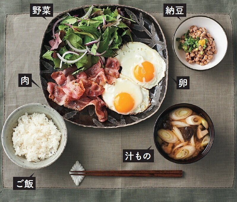 朝しっかり食べることで、1日の脂肪燃焼にエンジンがかかり、やせやすい体に。肉や卵などの動物性たんぱく質を中心に、納豆や豆腐の植物性たんぱく質、汁もの、野菜を。ご飯やパンもOKだけど、まずはおかずを食べ切るのが先。