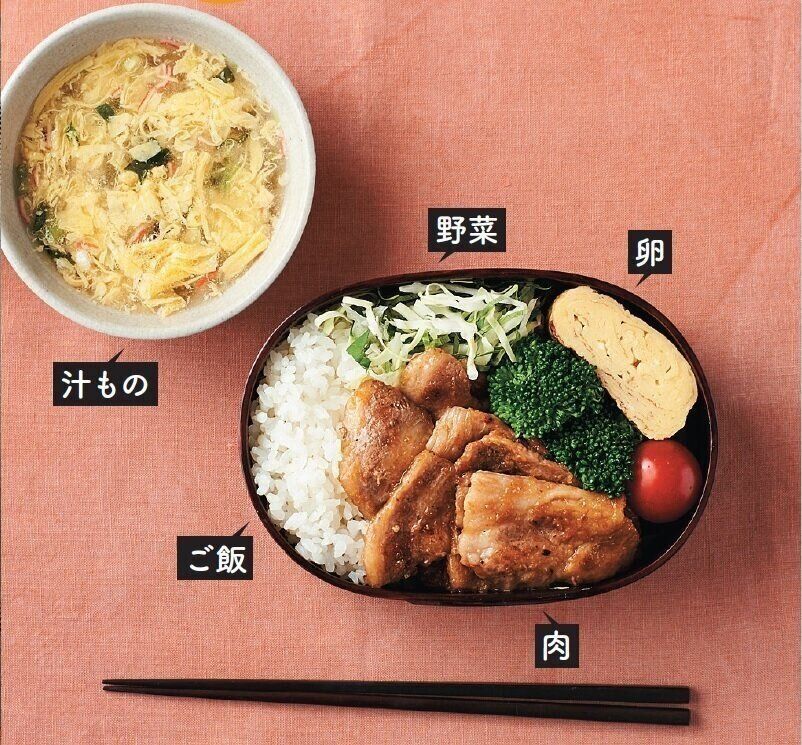 べんとう箱は「まずご飯で埋める」のではなく、肉や野菜をたっぷり詰めたあと、すき間にご飯をたす感覚で。インスタントでもOKなので温かい汁ものを添えることで、満腹感アップ。コンビニで買う場合も、たんぱく質を重視して。