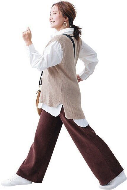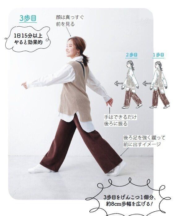 頭は真っすぐ上から引っ張られているような気持ちで、10m先を真っすぐ見ます。ひざを曲げずに、1、2歩目は普通に歩き、3歩目だけげんこつ1つ分いつもの歩幅より前に出し、かかとから着地すればOK。意外にもまわりからは普通に歩いているように見えるから、毎日の習慣にして!