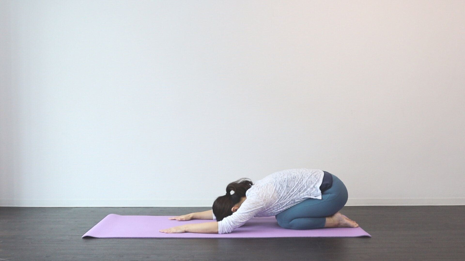 ポーズを行なった後は、お尻を踵に下ろしおでこを床にあずけた「子どものポーズ」でお休みします。