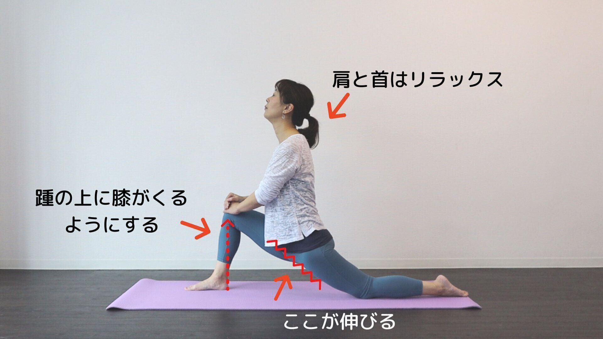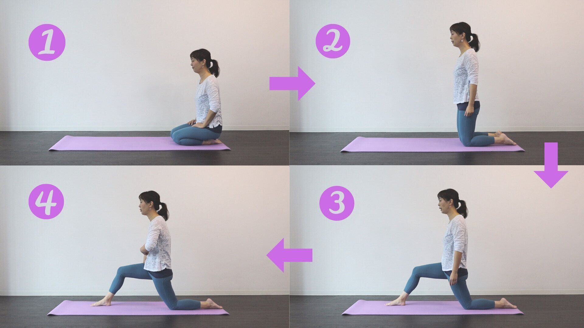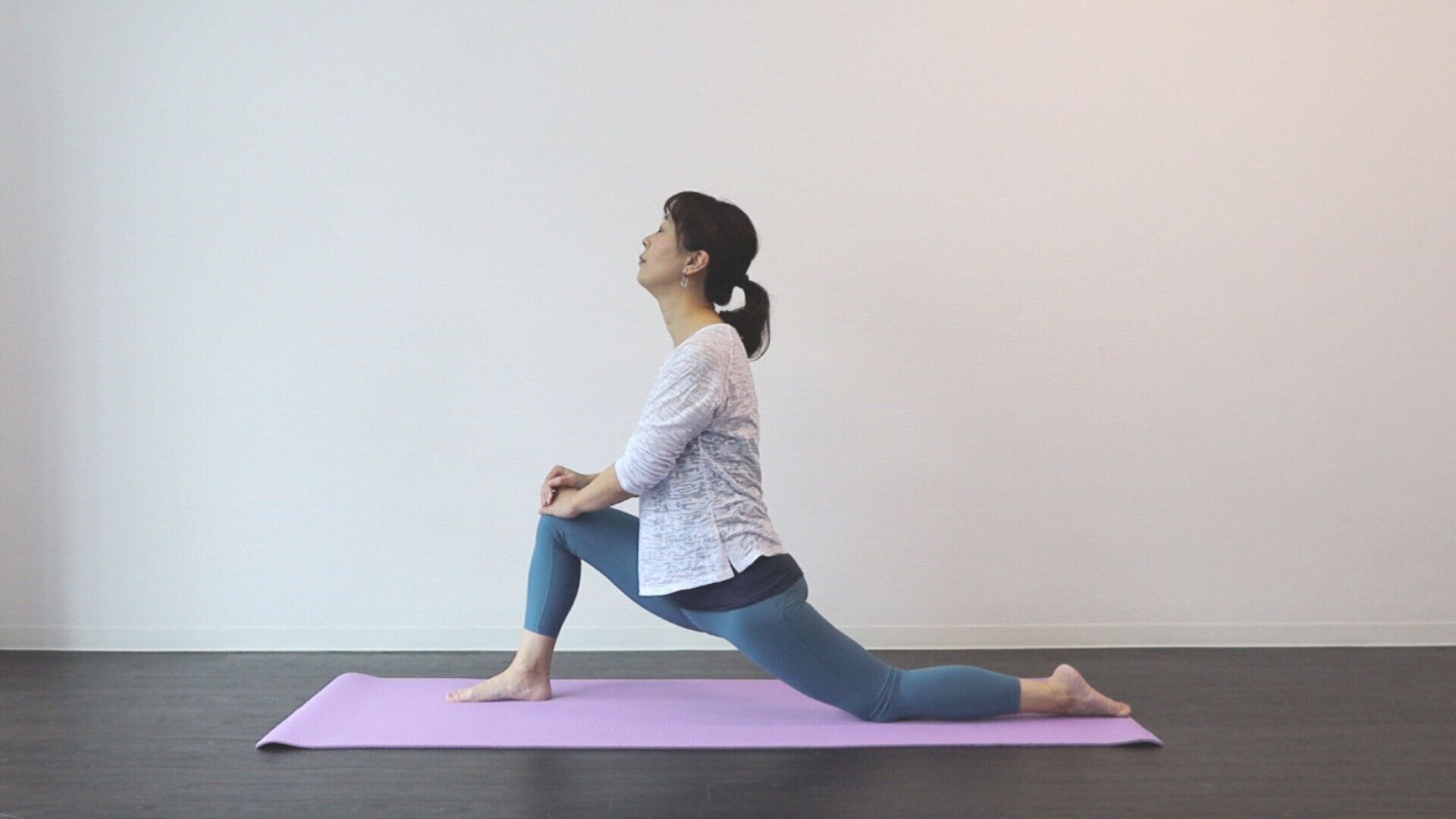 足のつけ根とお腹を伸ばす「三日月のポーズ」をご紹介しました。