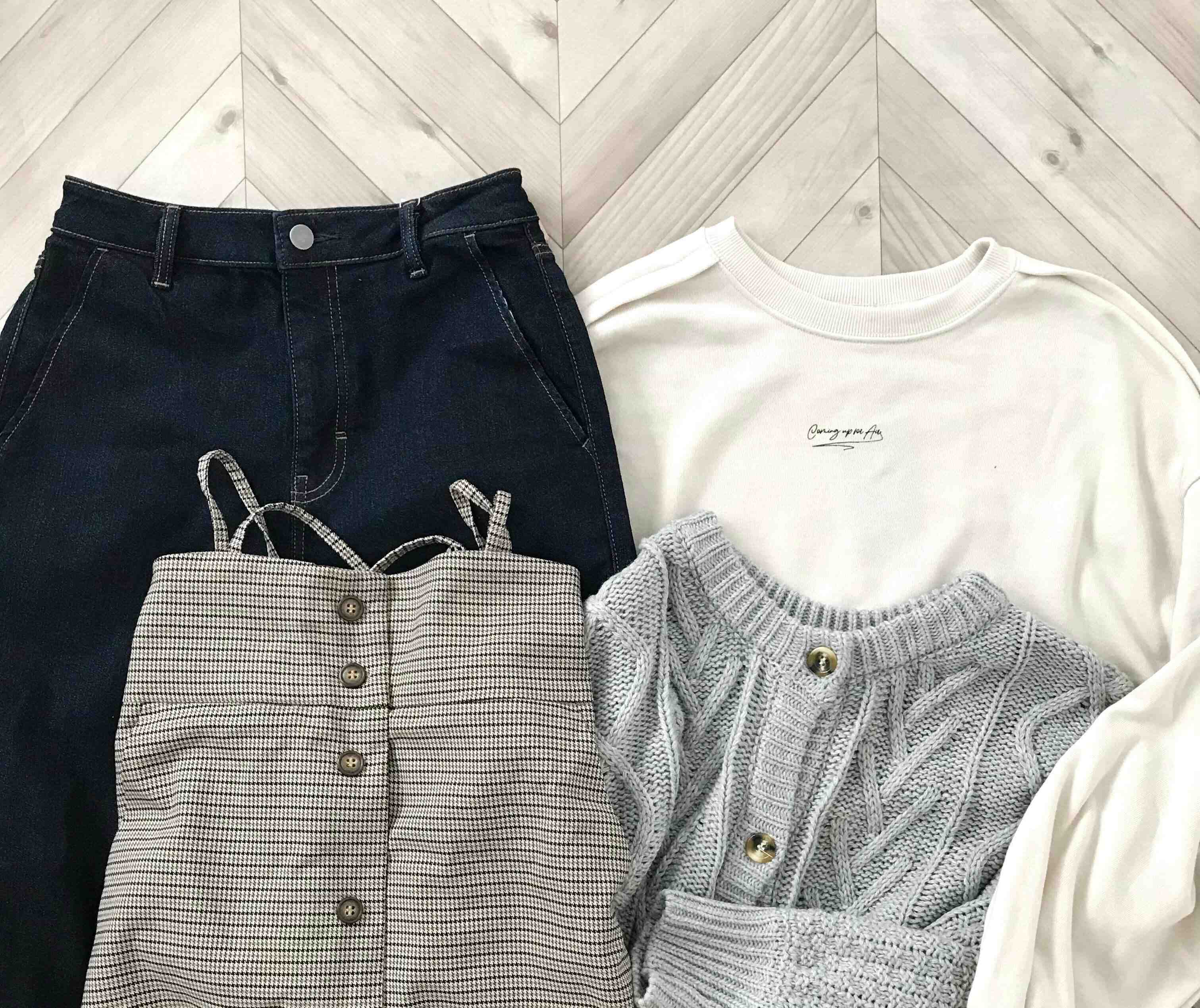 左上から時計回りに「フラシ使いプルオーバー」、「ケーブルカーディガン」、「サスペンダー付きスカート」、「デニム」。