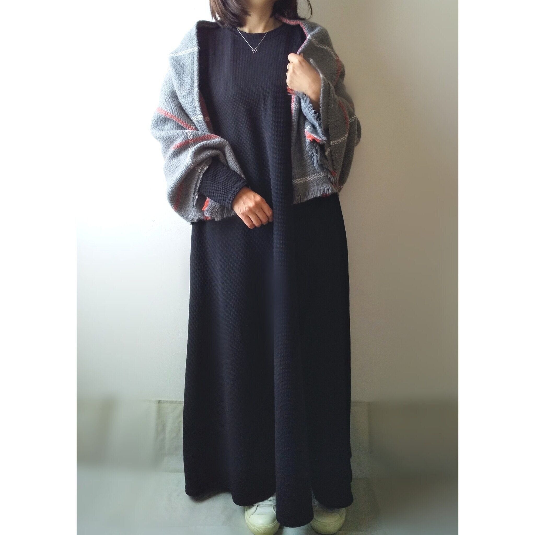 シンプルなワンピースなので、柄物のストールがよく合います。