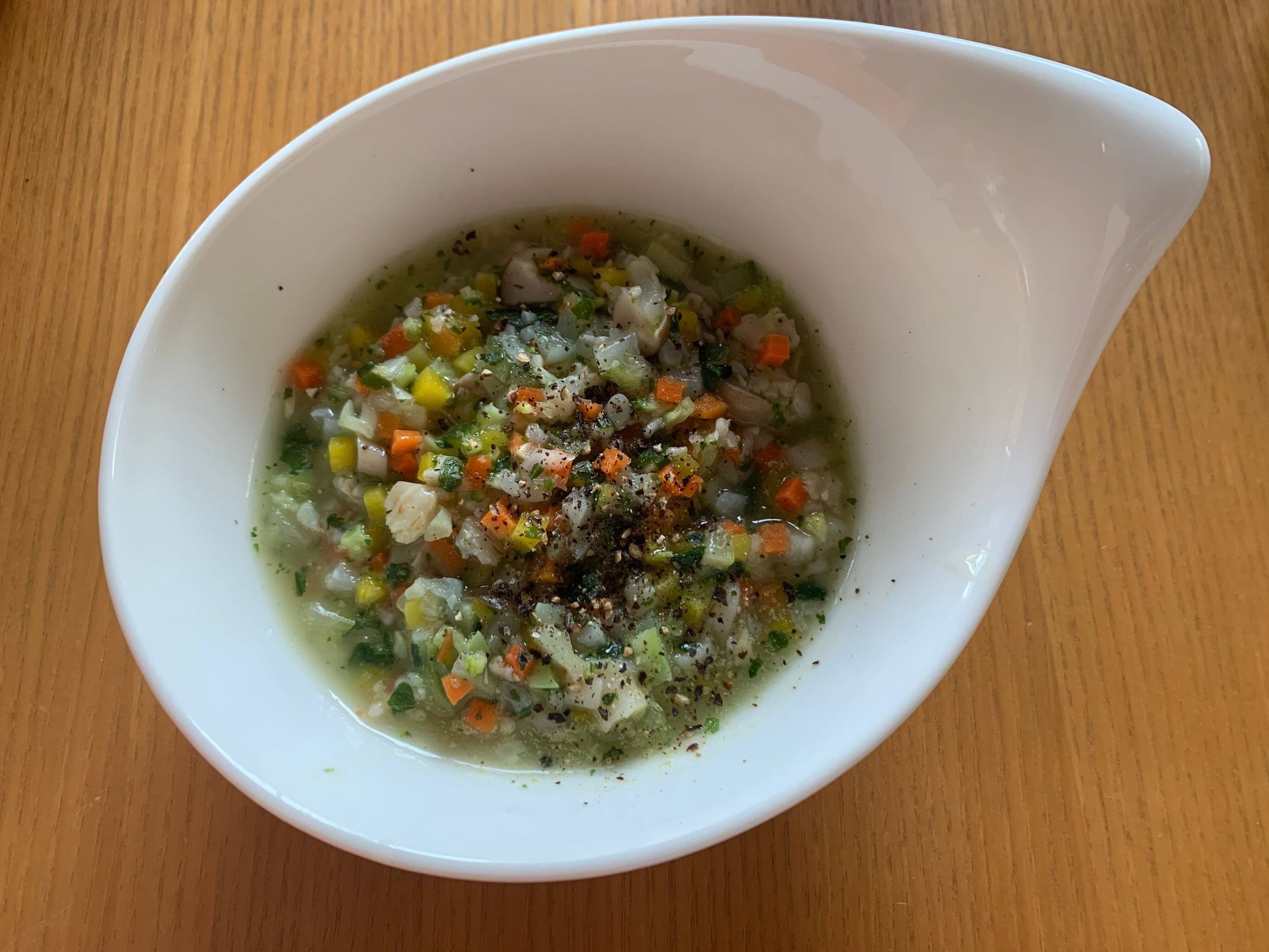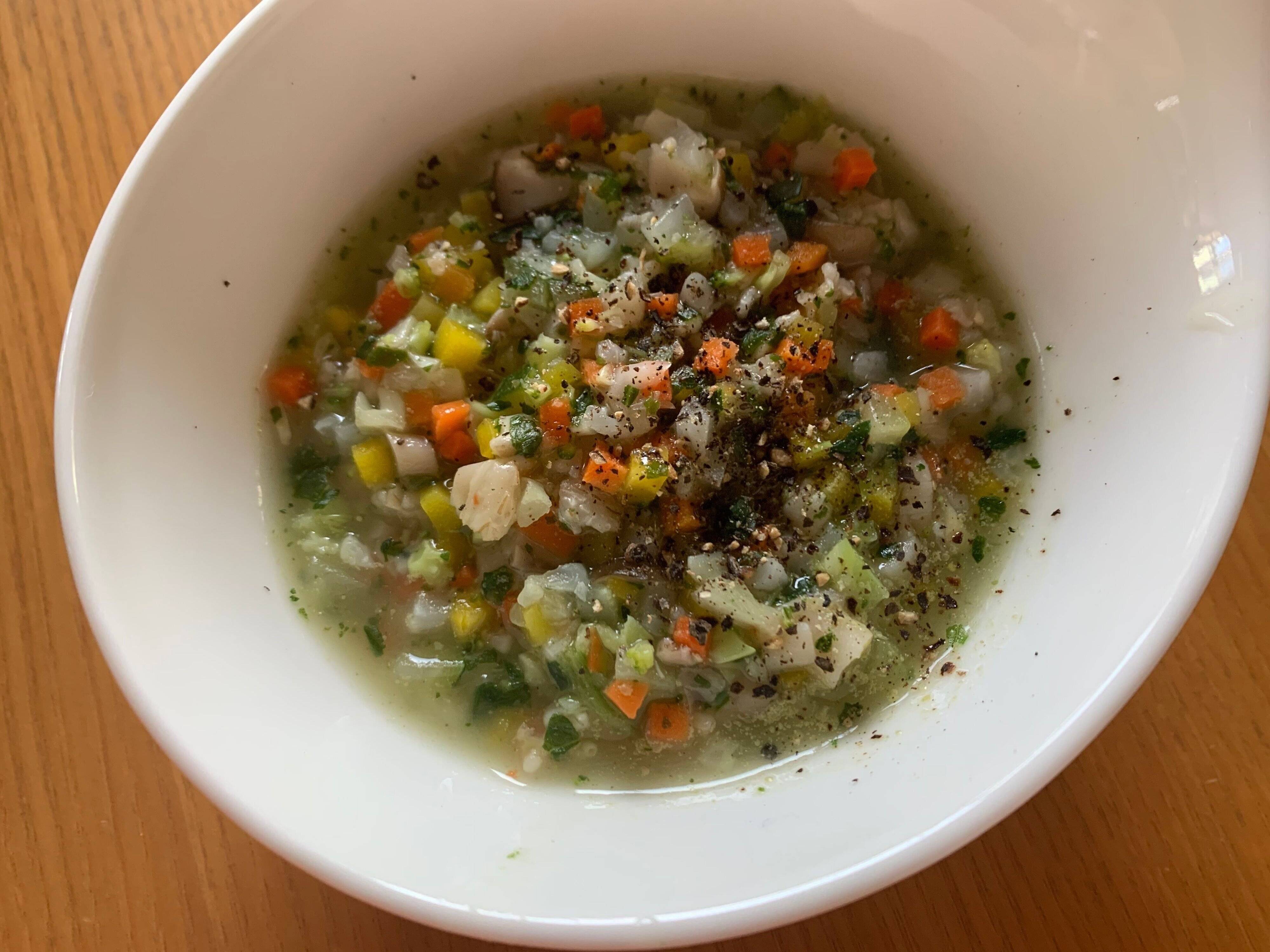鍋に、「お米のかわりに食べる6種の彩り野菜」と水、コンソメを入れ、その他、オートミールや余りご飯があったら投入。たんぱく質が不足するので、お肉やツナ缶などあれば尚良いですが、それすら面倒だったら、追加でゆで卵を食べておけば問題なし。