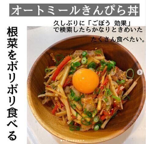 千切りのごぼうとにんじんに肉を加えた「オートミールきんぴら丼」は、オートミールをご飯の代わりに使用したヘルシーな丼ぶりです。噛みごたえもあって腹持ちもよい根菜がたっぷり食べられるため、ダイエットに適したメニューでしょう。
