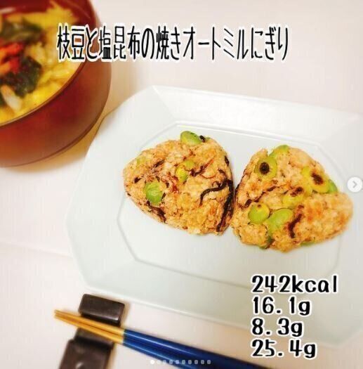 彩りが鮮やかな枝豆と、風味のよい塩昆布が特徴のアレンジおにぎりです。食べごたえも栄養バランスも抜群で、ダイエット中でも食事を楽しめるでしょう。