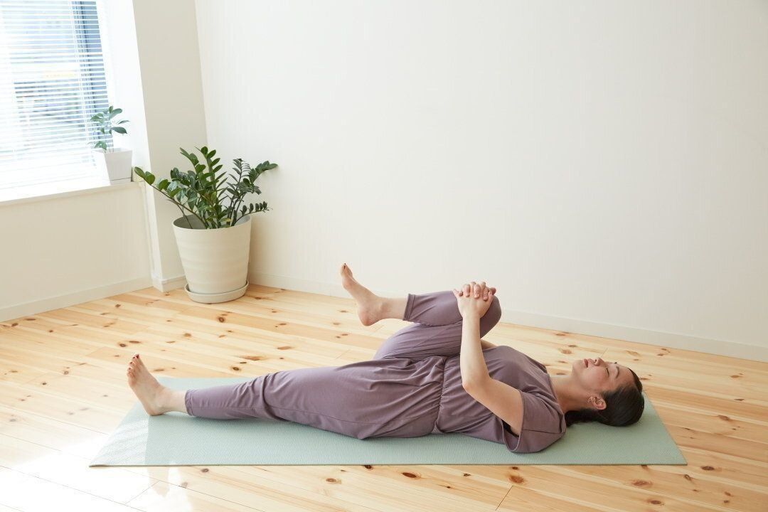 おすすめは、寝たままでできる「片ひざを抱えたポーズ」です。仰向けになって、片ひざを胸に引き寄せるだけで、筋肉もほぐれてリラックスできるでしょう。