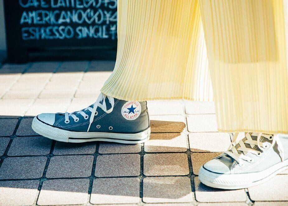 くるぶし丈のパンツには、中途半端に靴下が見えるローカットより、ハイカットのスニーカーを合わせて。「明るい色のパンツには、黒よりもグレーのコンバースを選ぶと◎」。