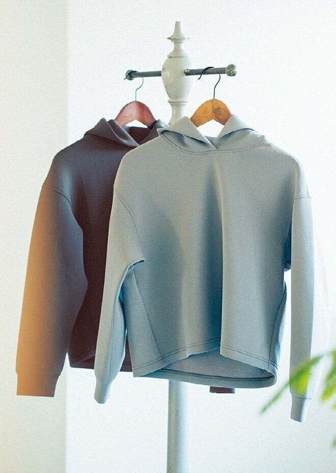 「とにかく生地が優秀。ストレッチがきいていてシルエットがキレイに出るし、しわにもなりにくい。パーカーでもスタイリッシュに見えるんです。少しゆとりがあって丈が短めのデザインが、スタイルをよく見せてくれる効果も。さらに、洗濯してもすぐ乾くというおまけつき!」。