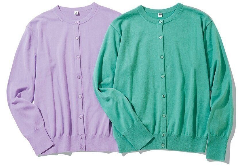 定番アイテムは、色で季節感を出して。「UVカットスーピマコットンクルーカーディガン」(グリーン、パープル、オフホワイト、グレー、ブラック、ピンク、ナチュラル、イエロー、ライトブルー、ブルー、ネイビー・全11色)/ユニクロ