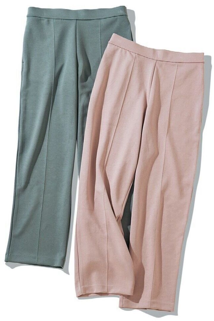 センタープレス入りでキレイに見えるジャージ素材。脚のラインを拾わない絶妙の太さ。「ストレッチダブルフェイスストレートパンツ」(ピンク、グリーン、ダークグレー、ブラック、ナチュラル・全5色)/ユニクロ