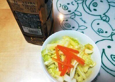 サラダのドレッシング代わりにオリーブオイルを活用。「りんご酢をプラスしてみたら、風味がよくさらにおいしくなりました!」。