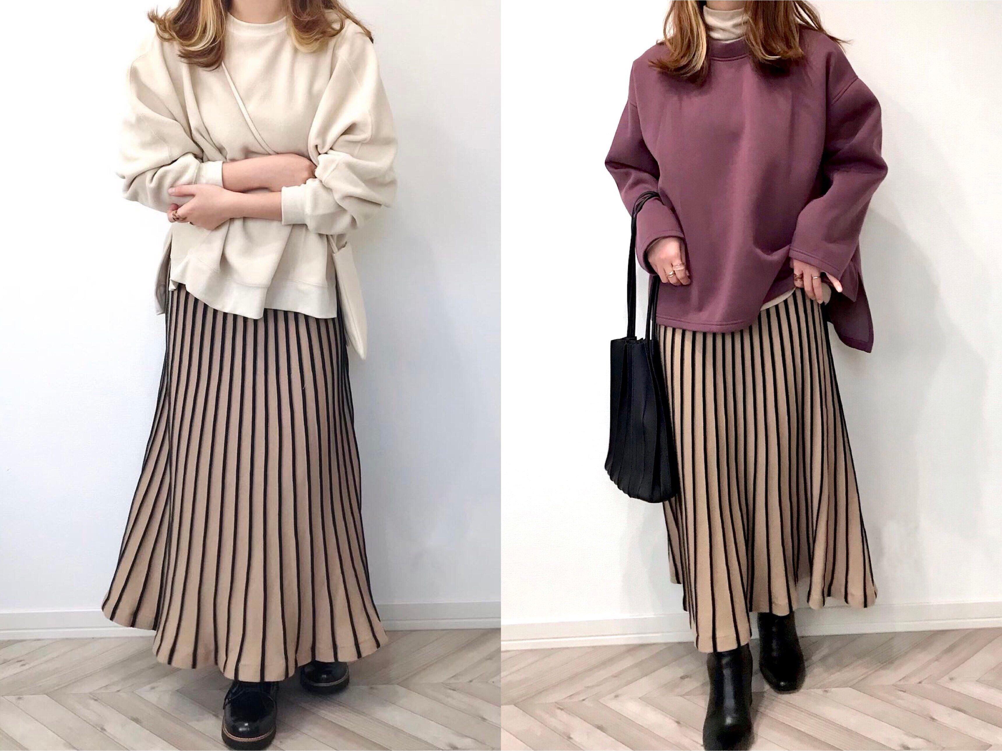 こちらはベージュと黒の配色のニットプリーツスカートです。