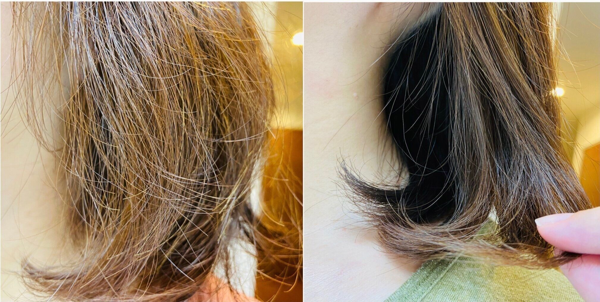 左はただ乾かしただけ、右は濡れた状態でヘアミルク→8割ドライでオイルをつけた状態です。