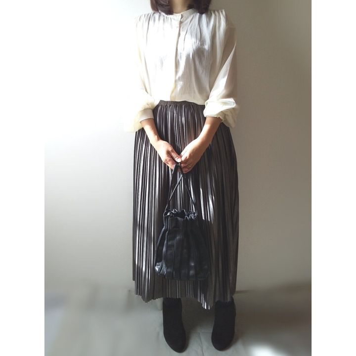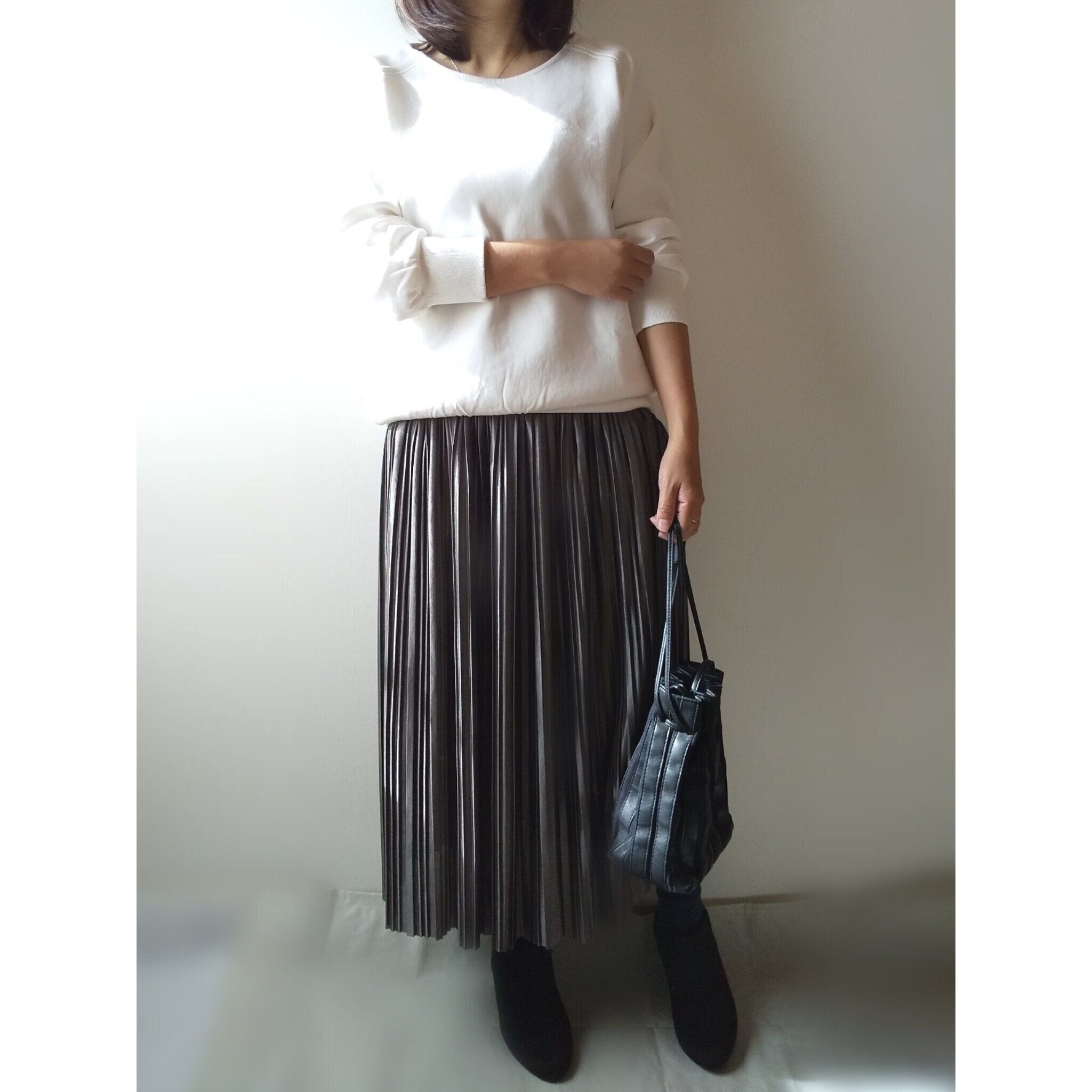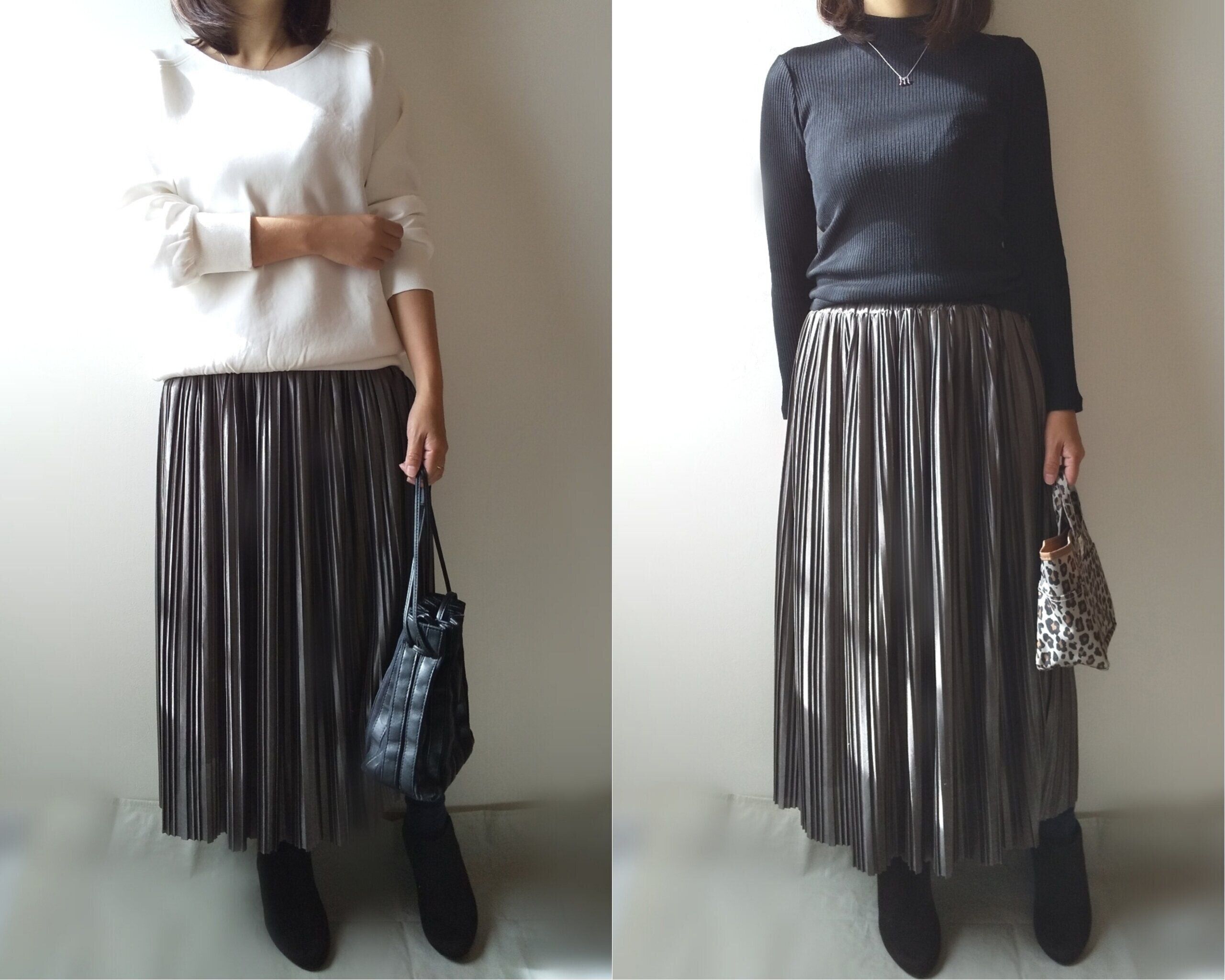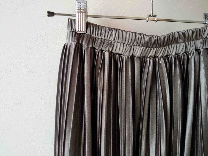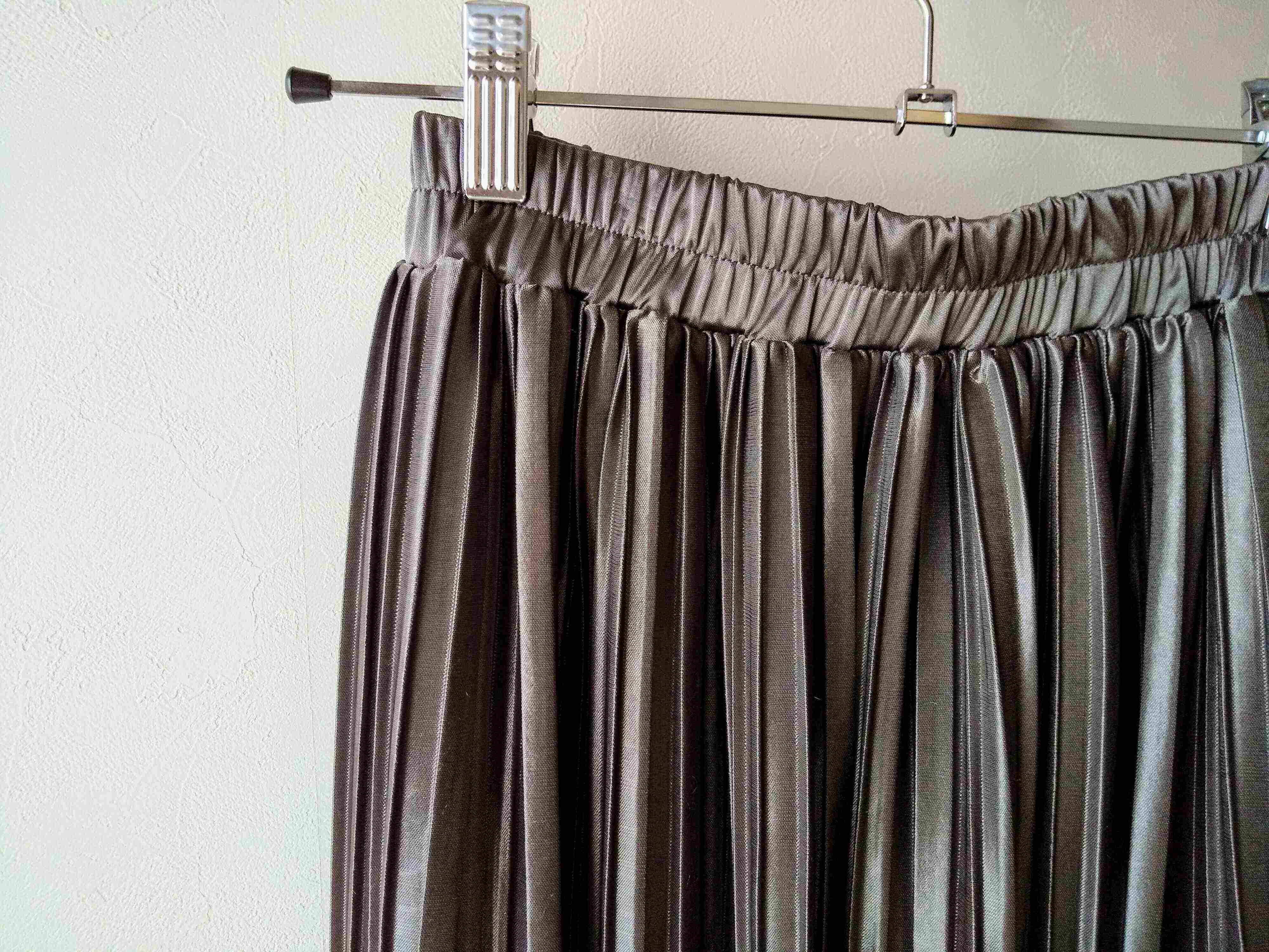 こちらのcocaのプリーツスカート、なんと1,089円でした!ツヤ感があってとても高見えする生地感が伝わるでしょうか?メタリック調のチャコールは、ブラウンやカーキの混ざったようなニュアンスカラーでとてもよいお色でした。プチプラなのでウエストは総ゴムですが、そこは着方でカバーできるので問題なし。むしろ、ラクチンなのでふだん着るのにちょうどよいです。そして、オンラインショップで購入したので小さく畳まれて届きましたが、広げたときにシワ1つありませんでした!滑るようなサテンのような生地でかなりシワになりにくい素材です。