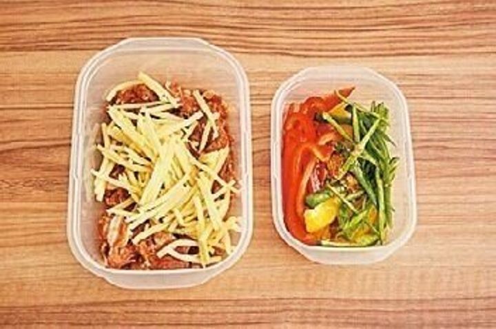 (2)(1)にふんわりとラップを掛けて、電子レンジで2分30秒加熱する。副菜は取り出して混ぜる。(副菜が半熟なら、さらに20~30秒加熱する。)主菜はさらに2分30秒加熱して混ぜる。