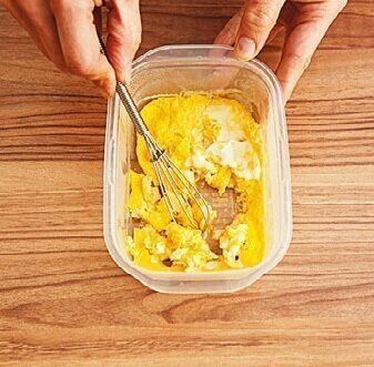 ※ラップを敷いてから材料を入れると、耐熱容器にケチャップの色が移りにくい。