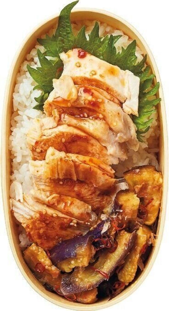 (2)(1)を電子レンジで6分加熱して取り出す。鶏肉はそのまま3分蒸らし、なすはラップで包んだまま流水で3分冷やす。鶏肉は斜め薄切りにして混ぜた[A]をかける。なすは細く裂き、長さを半分に切って[B]であえる。