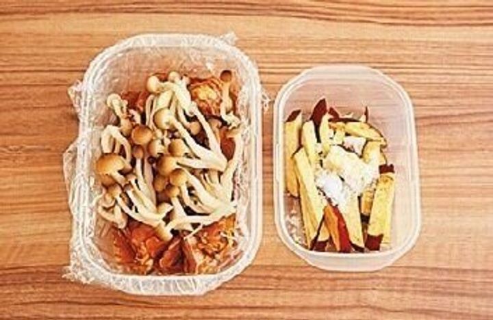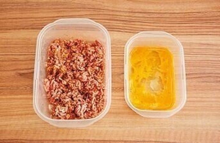 (2)(1)にふんわりとラップを掛けて電子レンジで5分加熱し、それぞれよく混ぜる。