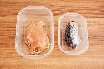 (1)耐熱容器に鶏肉を入れて酒をふり、ふんわりとラップを掛ける。なすはラップでぴったり包み、別の耐熱容器に入れる。