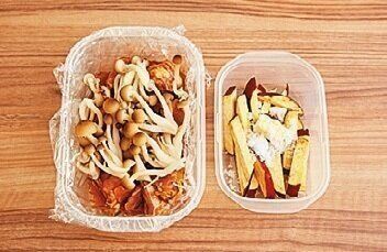 (1)耐熱容器にラップを敷いて鶏肉、[A]を入れてもみ、しめじをのせる。別の耐熱容器にさつまいもを入れて、[B]を加える。