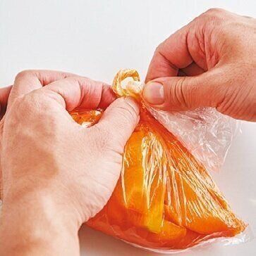 ●ポリ袋の口をとじるときは、空気をしっかり抜いて、材料のすぐ上の部分から袋をねじってひも状にし、根元で輪っかを作り、そのすぐ上の部分を輪に通して引っ張ると、通した部分が輪っかになってギュッと結べます(引き解け結び)。開けるときは、袋の口を引っ張ればスルッとほどけます。