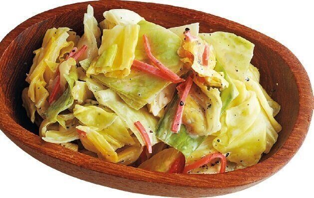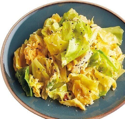 塩キャベツ全量をざるに上げて水けをきり、サラダ油大さじ1/2で炒め、溶き卵2個分を流し入れて炒め、粗びき黒こしょう少々をふる。