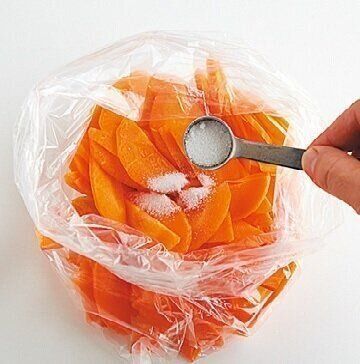 しばらく漬けて野菜の水分が抜けてかさが減ってきたら、袋の空気を抜いて口を結び直すと密閉状態になり、おいしく漬かる。