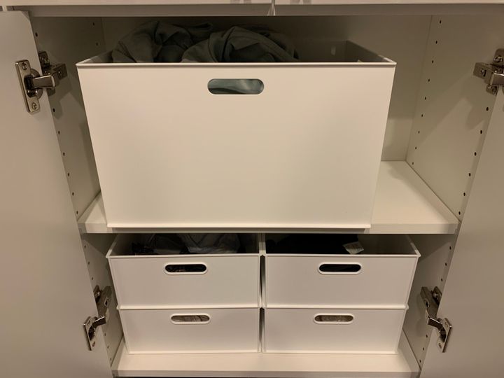 洗濯物は畳まず、カゴにぽいっと入れます。白いカゴで揃えれば、見た目もスッキリ。今のところ、タオルだけは畳んでいますが、ちょうどいいカゴを見つけたら畳まない収納に変えたいと思います。