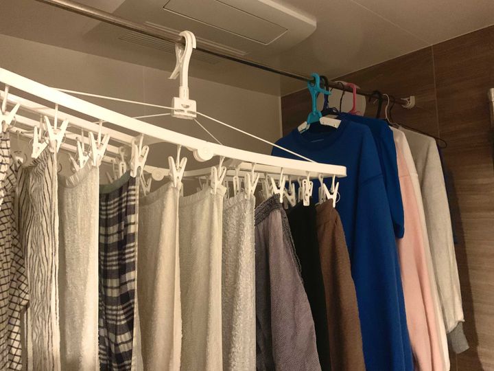 そこで、室内で物干しハンガーにかけてから、ベランダに持っていくことに。うちは浴室でかける作業しているので快適!洗濯機の隣に「ホスクリーン」など物干し竿を設置できるものもあり便利です。