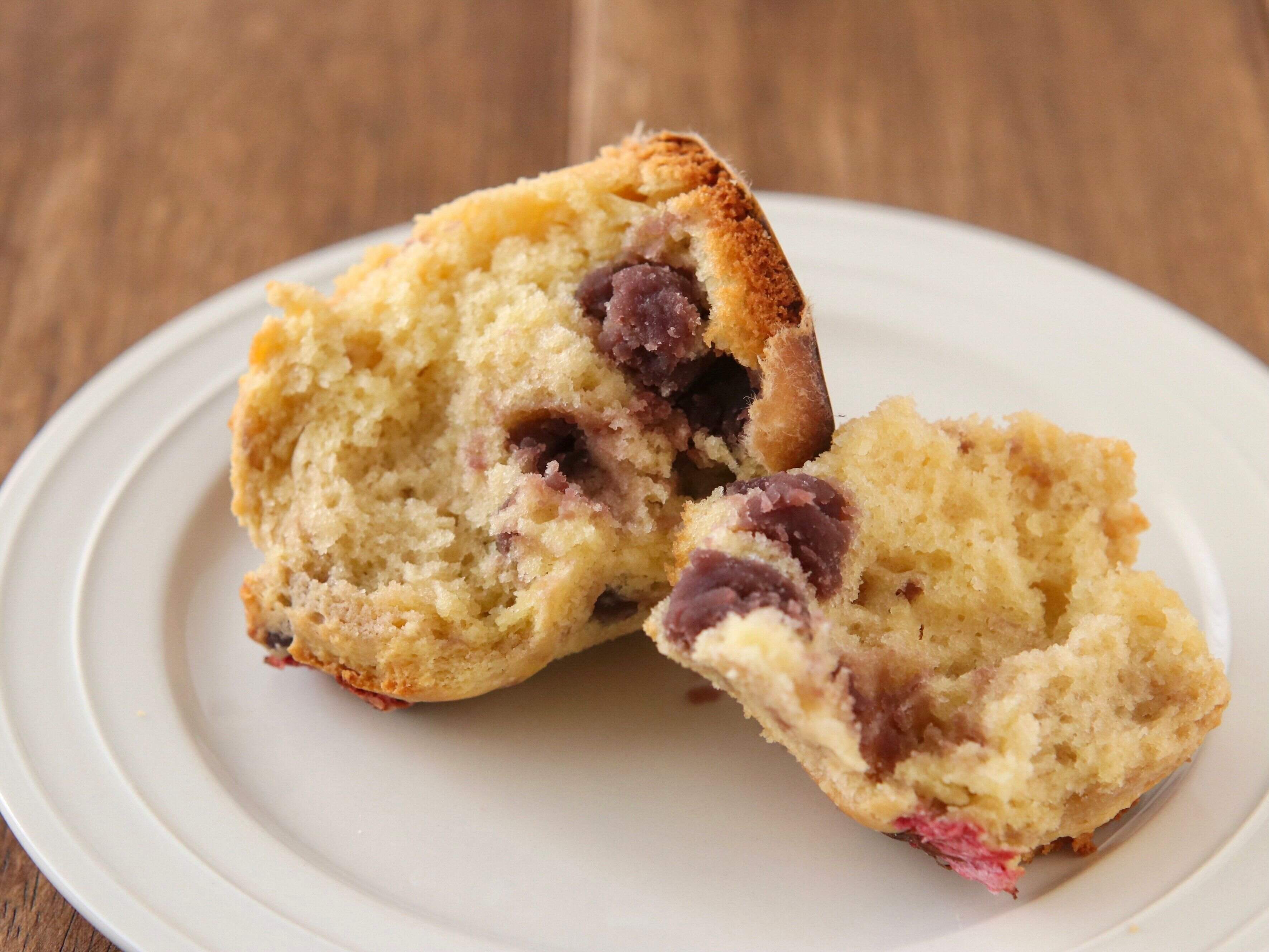 焼き立てを食べるとマフィンの表面がサクっとしています。また、ホットケーキミックスでつくったマフィンは、薄力粉を使ったものより食感がボソボソしやすいですが、あんこが入ることでしっとり感もプラス。翌日の方がよりしっとりしますよ。