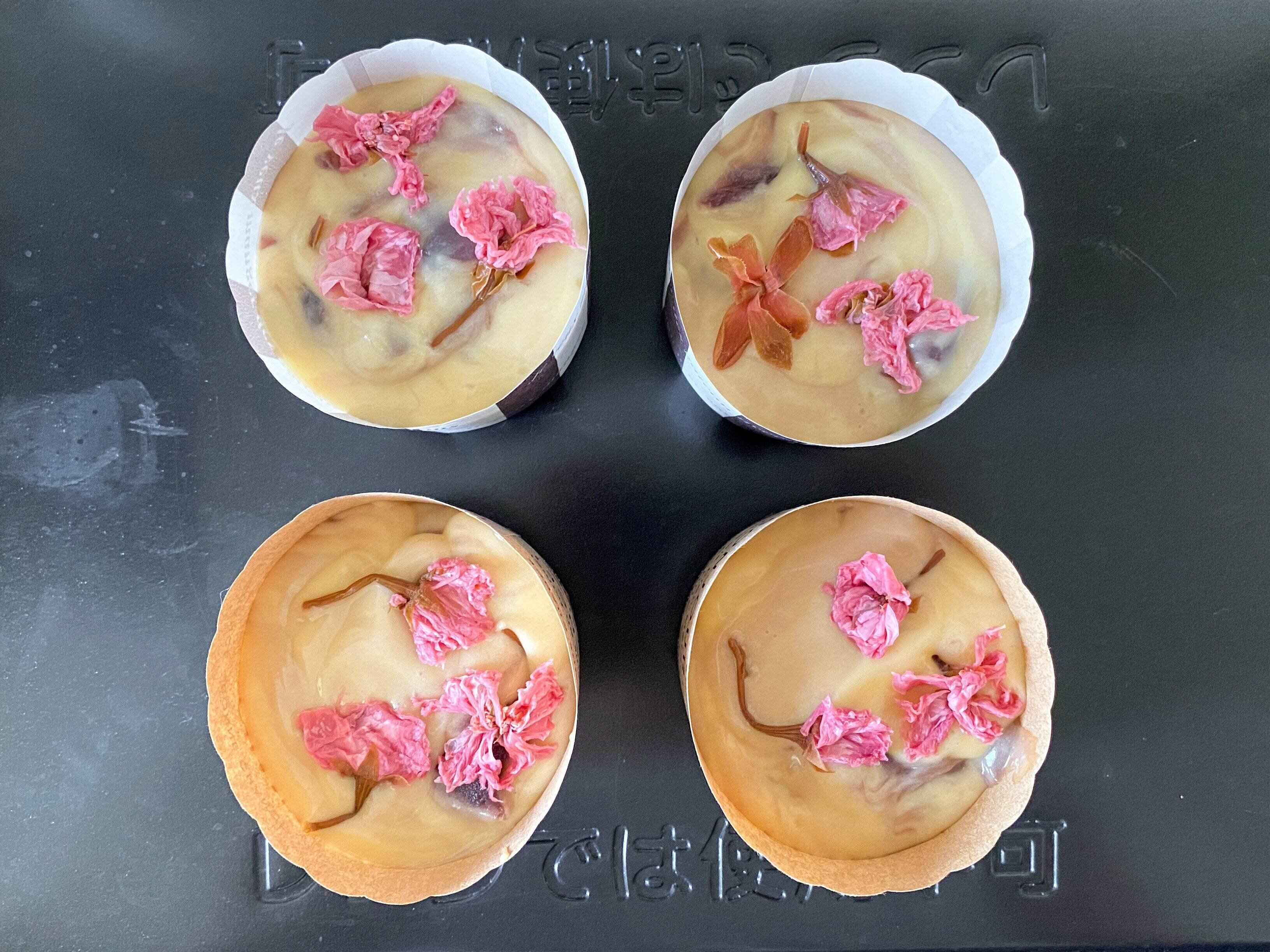 【4】 マフィンカップに均等に入れたら、桜の塩漬けを表面に散らし、170度に熱したオーブンで25分焼く。